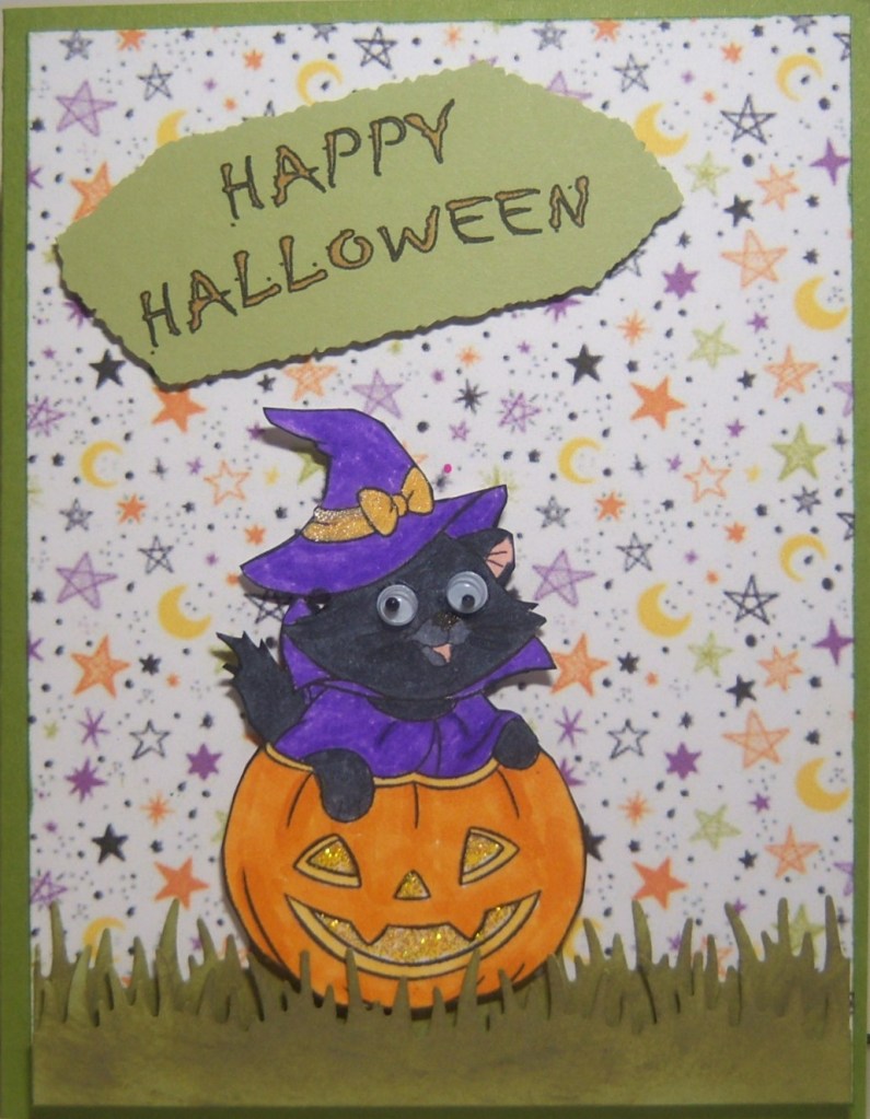 Time again for dear-old-sister’s chuckle of the month. Sentiment “maybe someday I’ll finally get what I deserve, but I hope not” is from a Garfield cartoon. Image and thought bubbles were found online. After printing the sentiment I fussy cut bubbles and image. Oval is Spellbinders Scalloped Ovals, embossed border is Cuttlebug embossing borders. There are 5 different borders in the package. Normally I don’t emboss the card base nor the inside but I think it works well on this card.