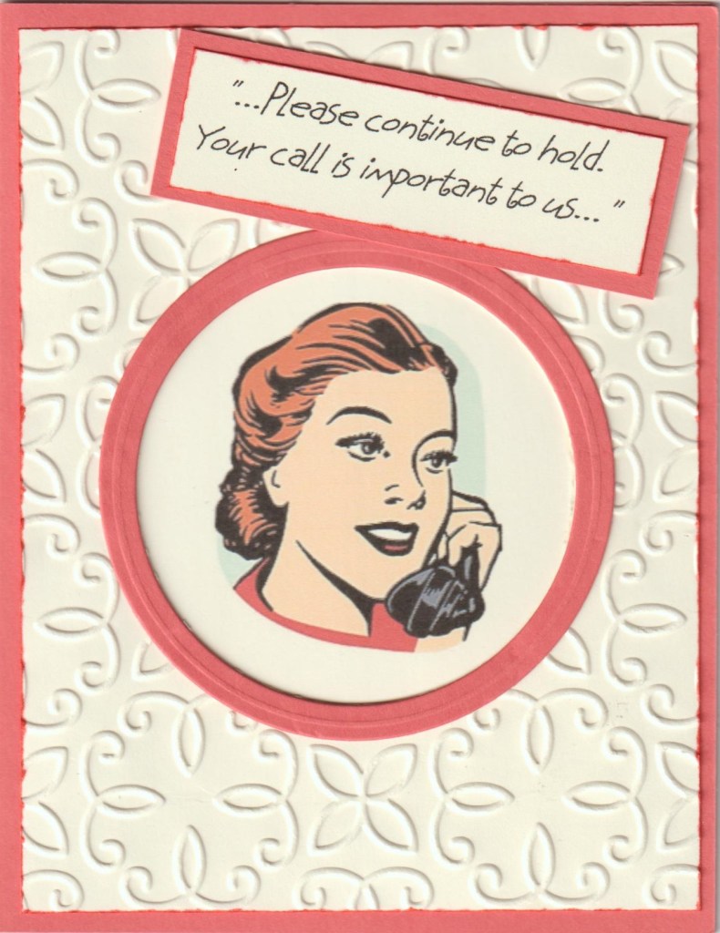 Today’s card will be entered in CYHTP with a twist of pumpkins. The background is an embossed piece from my stash. I’m a little confused because in the photo the background looks like the debossed side is showing but not in real life. hmmm. Pp was found online, photo corners are hand cut, center strip was cut on my paper trimmer. Pumpkin is from an online coloring page, colored with Copic’s, fussy cut and popped up. After coloring the pumpkin, and before fussy cutting, I put the paper back in the printer and added the sentiment.