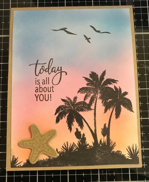 It has been a loooooong time since I posted a card. I needed a beach themed card for a friend who loves all things beachy and I was inspired by a card Stamp Buddy Gayle posted. I ink blended Peach Bellini, Bubblegum Pink, Lovely Lavender and Blue Sky. The palm trees and sentiment are from Ocean Silhouettes by GKD. I included a starfish from At the Beach by JustRite, since her favorite inspirational story is about a little boy an a starfish.