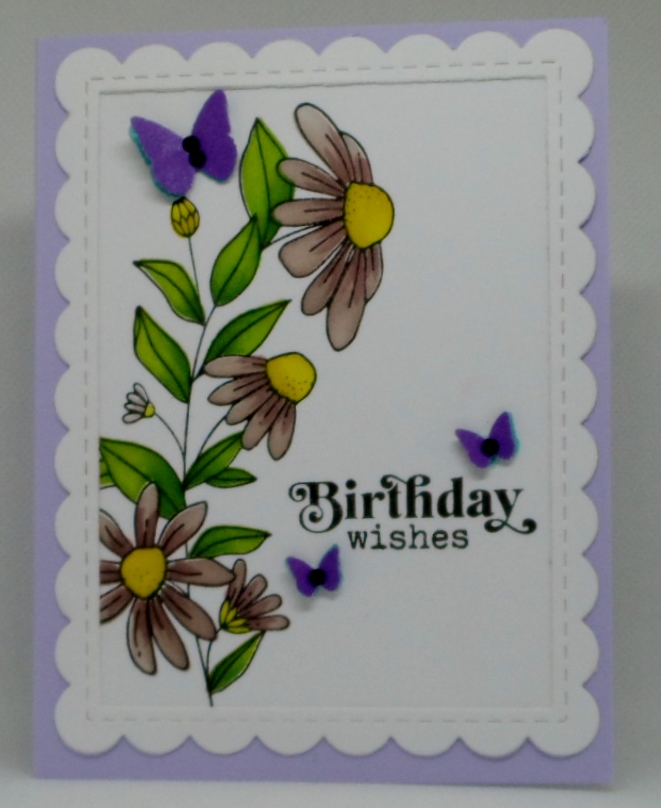 Daisy Dreams by Taylored Expressions is my focal point for this card. The set is a stamp/stencil combination. Somehow my white daisies didn’t work out so I added some color that was left on a brush…..still not satisfied so I flicked a bit of OLO marker ink onto the petals. Butterflies are Martha Stewart 3 butterfly punch.
