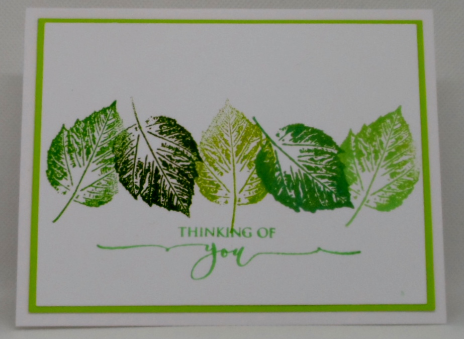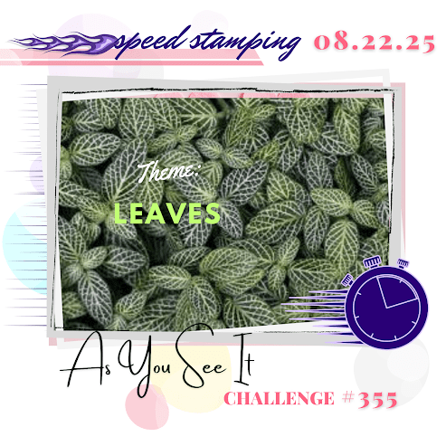 After deciding on a variety of green inks from Taylored Expressions, chosing a sketchy leaf stamp and a sentiment and my card stocks, I was ready to start the time on this CAS card. My first Gina K Autumn Silhouettes leaf was stamped using peapod ink and a quick swipe of a baby wipe and dry towel, the next color was sweet basil, then granny smith, then spearmint and finally mint julep. The focal panel was rushed to my Big Shot with a Waffle Flower A2 layering die, then back to the misti to position and stamp the Gina K Scripty Sayings 2 sentiment in the mint julep. This was layered on a piece of green cardstock and cut to size on my paper cutter and finally layered on my A2 notecard. Completed in 5 minutes, 7 seconds. I did find that stamping with ink cubes was a bit more time consuming than a full size pad. It also helped to have a stamp set that was a bit sketchy and the leaves overlapping slightly to hide any oops! Another fun Speed Challenge with:
