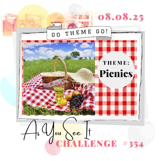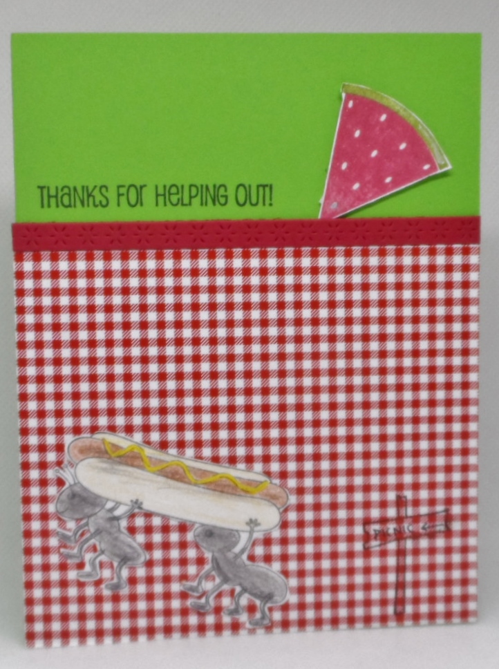 A picnic themed card for me today and a challenge at As You Can See It Challenge #354 – Dining Al Fresco picnic theme. I chose patterned paper that would resemble a red checked picnic tablecloth on green cardstock for the lovely color of grass however those little ants carrying away my hot dog remind me to sit at a table instead of the ground. My stamps are from older Gina K Designs stamp sets: Cute as a Bug and You’re the Sweetest.