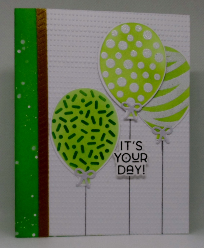I am in a green mode…..lots of green grass…..green leaves…..or is it just that the green inks from my last project are still on my desk! Probably the last!!! My card project uses Taylored Expressions Halftone Dots embossing folder, Birthday Balloons stencil & die combo and a previously sentiment from my stash. The balloons were colored using the stencil, then white pigment ink through the decorated stencil and white heat embossed with the exception of the green on green sprinkles balloon. The tiny bows are also a TE product as is the gold strip. A bit of ink blending on the note card and white spatter completes my card today. This card will be shared with: