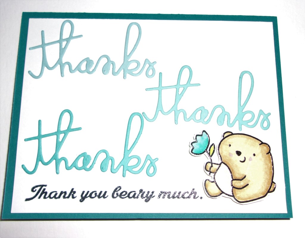 I used the sets Courteous Cuties and Courteous Cuties 2, along with the Thanks Word Die to complete the card. The paper is from Gina K Designs in the gradient of turquoise colors: Sea Glass, Ocean Mist, Turquoise Sea, and Tranquil Teal for the cardbase. The white is Hobby Lobby 110 pound heavy cardstock.