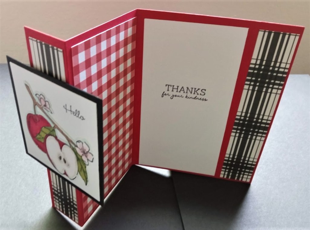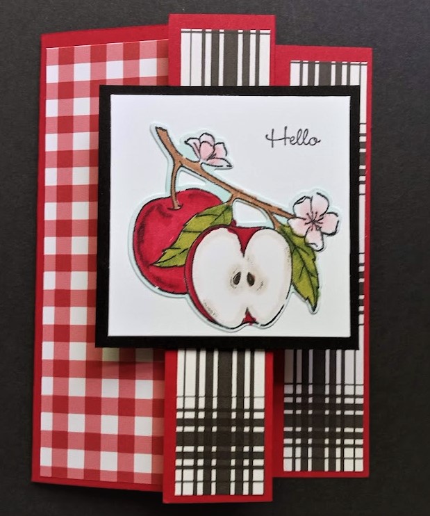 I spent time coloring and creating a fun fold using the Apple Harvest Stamp set. I saw this idea on Pinterest and found it interesting, so I went to the website. Stamping Amore is the person who created the original card I used for inspiration. I used the same stamp and die set, but colored mine differently and used paper that I had.