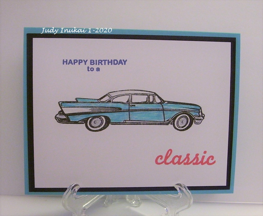 The ’57 Chevy was what sold me on this fun set called Classic Dad by Dare 2B Artzy. Wouldn’t it be fun to go cruisin’ in this sweet ride? The car was colored with Prismas: PC902, Light Aqua, PC905 Aquamarine, and PC938 White. I used a silver Sharpie on the hubcaps and chrome, then highlighted with clear Wink of Stella for shine. The sentiments were stamped in Blue Denim and Red Hot. The inside sentiment says “It took decades to look this good.” The focal panel is matted with Black Onyx on a Turquoise Sea card base. I have quite a few masculine birthdays coming up in March, so I have quite a few stamped up waiting to be colored and made into cards. I’m entering this in the Sweet Stampin’s For the Boys Challenge.