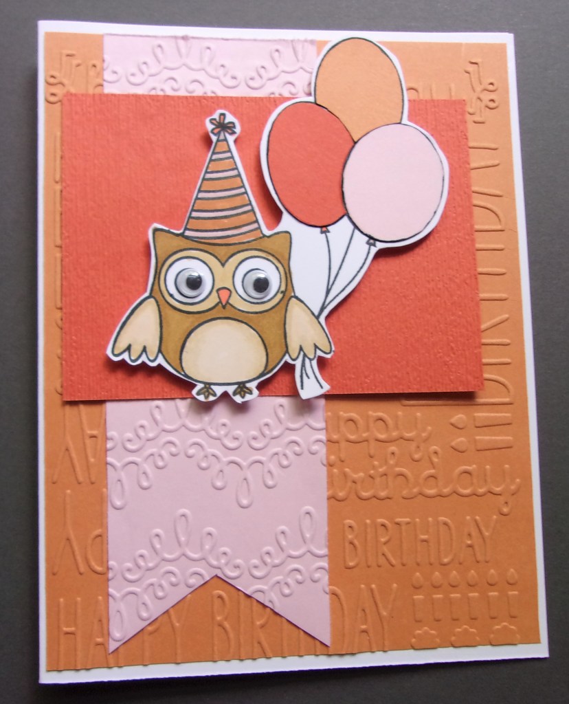 I used Gina K Designs Birthday Hoot set. I paper pieced the balloons with matching cardstock and colored the birthday hat and owl with markers. I struggle with leaving cardstock plain, so I added texture with embossing folders. I used Lifestyle Crafts Birthday set for the background and flag as it is a 2 folder set. I used the SU Subtle folder for the Tangerine Tango layer behind the owl. If course, the owl had to have googly eyes.