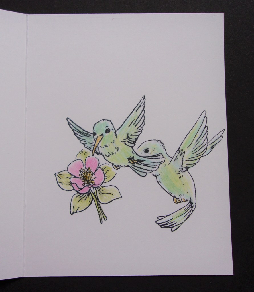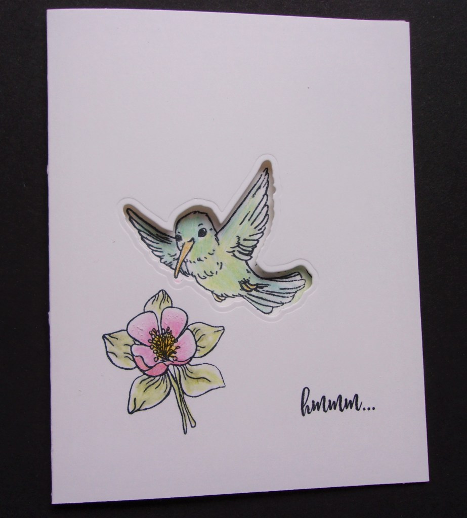 The flamingo is from The Stamps of Life, dated May 2016 The large tropical leaves are from Leave Me in Paradise, Catherie Pooler Designs, July 2018. There are small tropical leaves from Hero Arts, dated 2019. I used my MISTI for the background, placing the leaves on one half of the paper, stamping, then turning the paper and stamping again. All of the inks are from Gina K Designs.