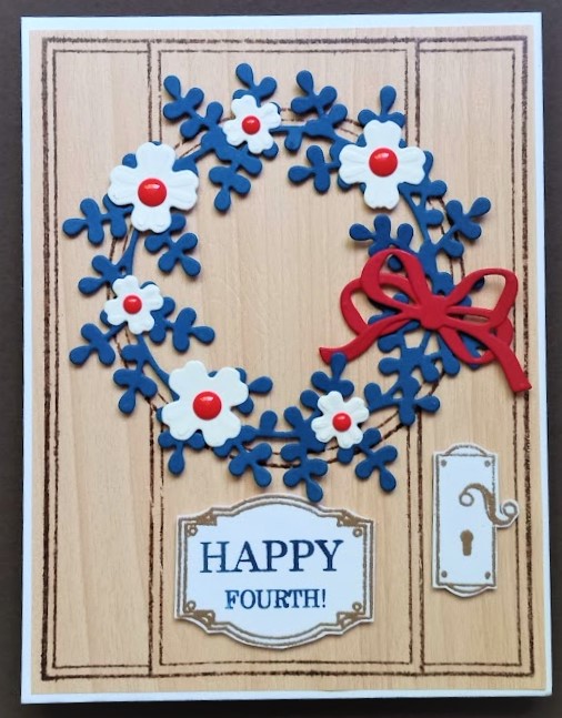 CC954 uses the colors Blueberry Bushel, Real Red, and white with a dessert of patriotic. My flag card uses Stamp Simply Grand Old Flag set. I added stars to the background with Lawn Fawn star dies. I embossed the background first with the SU stars folder. I have made this kind of card several times over the last few years and all went to a nursing home.