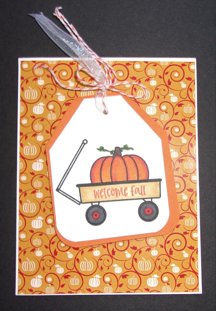 I started with the wagon and then added the pumpkin. I used Wheelie Full Wagon from Maymay Made It stamp set for all of the stamping. I didn’t have a tag die that fit the wagon, so I cut my own. Then I decided it needed something else, and I found a scrap of orange cardstock that matched the pumpkin and patterned paper well, so I cut another tag. I found twine and ribbon in my stash, so it went for tag embellishment. This was my World Cardmaking Day card and I enjoyed stamping and coloring.