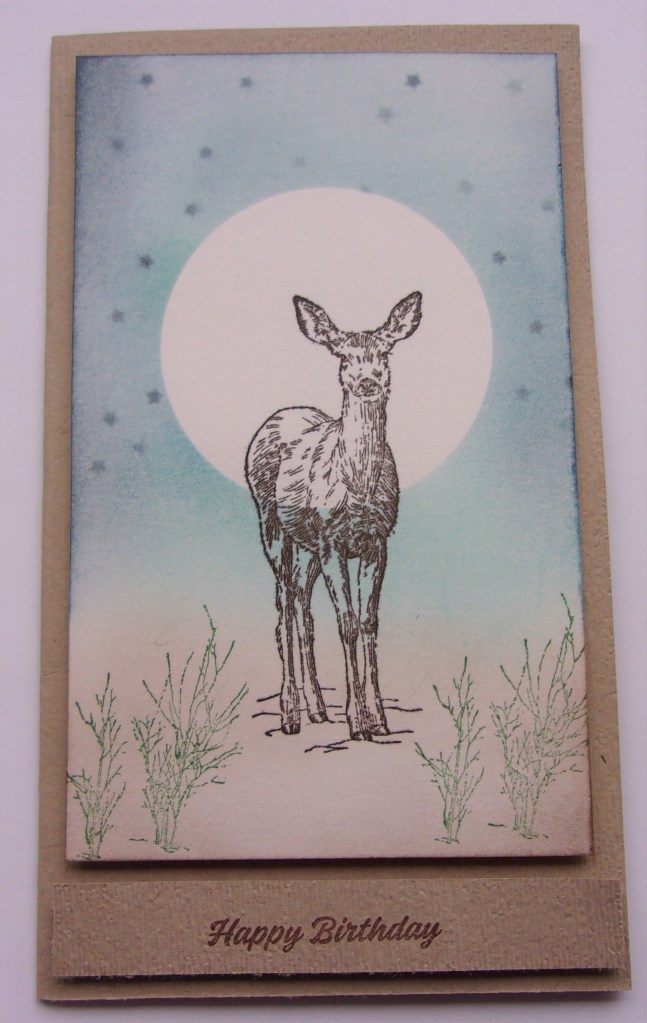 This was another card that was put off as it needed thought and research. I really do not make “moons” on cards so it didn’t come quickly to figure it out. In the end, I found an idea on Pinterest where the SU demonstrator explained what she did to place the animal in the moonlight. I die cut the moon using GKD masking paper and sponged ink around the mask. I removed the mask then stamped my images. I chose to not worry that my deer has blue sky and dirt on him. I used the Subtle Embossing Folder from SU to give the background texture along with the greeting. This is a mini-slimline card. I used a piece of Bristol paper for the focal piece, then made the card base to fit.
