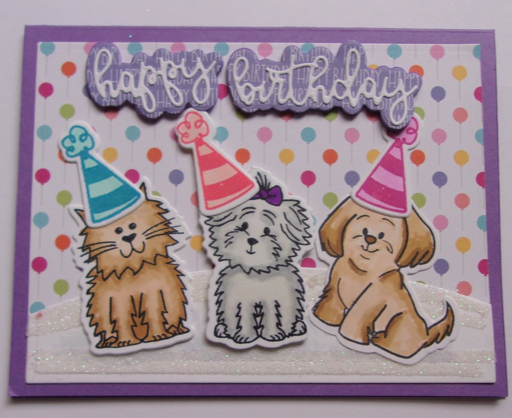 My niece loves animals, so I chose a few dogs and a cat to get the party atmosphere going. The dogs, cat, hats, and greeting are all from The Stamps of Life. The card base, balloon paper, and the shadow for the greeting are all My Favorite Things cardstock and patterned paper. I die cut an arc of white cardstock with a die that is Simon Says Stamp. I bought it used and I think it may be retired. I placed strips of double sided adhesive on the paper and added glitter. I hope it stays put without falling all over the place as my sister may not be happy when her daughter opens it.