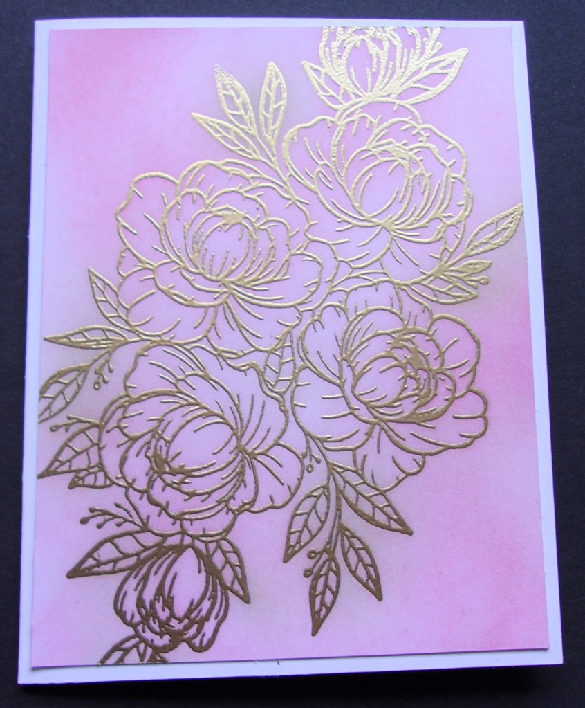 Emboss resist is the coloring method for intermediate stampers. Justine chose a large floral and embossed in white powder, then ink blended. I chose to emboss in gold as I knew it would pop, and it was laying there. I pulled out rose colors for my ink blending, all Lawn Fawn inks. I mounted the layer on white cardstock. Justine added a die cut greeting, but I think mine works without a greeting.