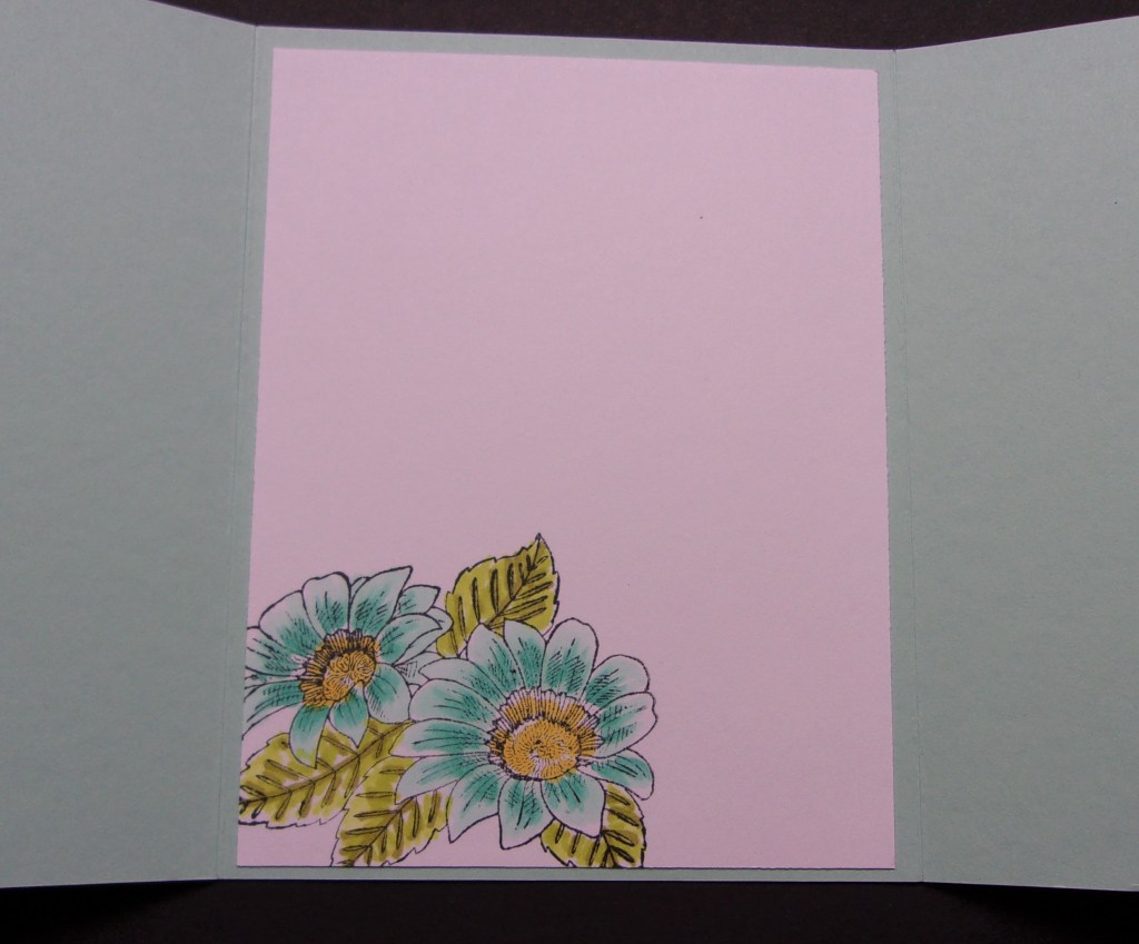 I am using cardstock that was cut and given to me. A couple of years ago, I watched a video and there was a giveaway for a card kit and all that was needed was a comment. I received the kit and the card she made. This kit has been sitting there waiting to be used, so today was the day. The card base is a pool color or a lighter blue. I found a patterned paper pad by Carta Bella that has this geometric print that I thought matched the card. I left an 1/8 inch border on the patterned paper pieces. I had the Penny Black floral set out and decided to add a floral to the front of the card. I used turquoise colors for the flower. I am fairly sure it is a daisy and for this card, it is a turquoise daisy. I stamped the same flower on the inside.