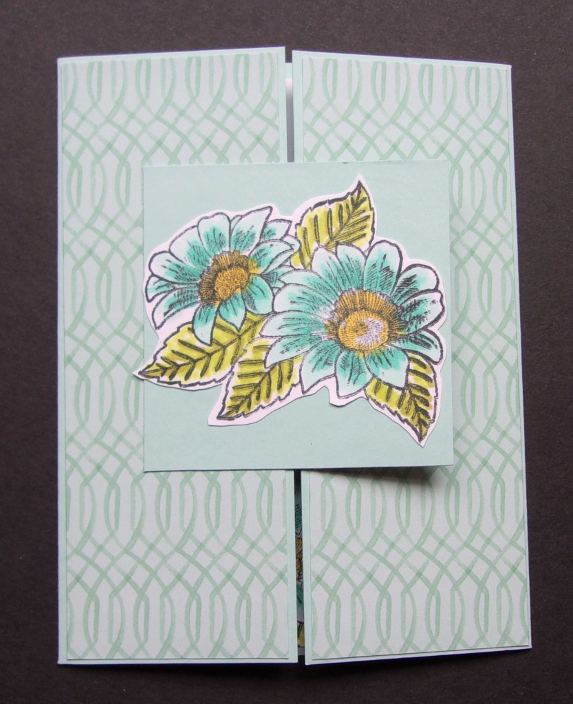 This is the last day of class and I think it is my favorite. I love fun fold cards. She began her lesson with Slimline cards, then onto Gatefold cards, and lastly the W-Fold card. I will show a Gatefold card this time.