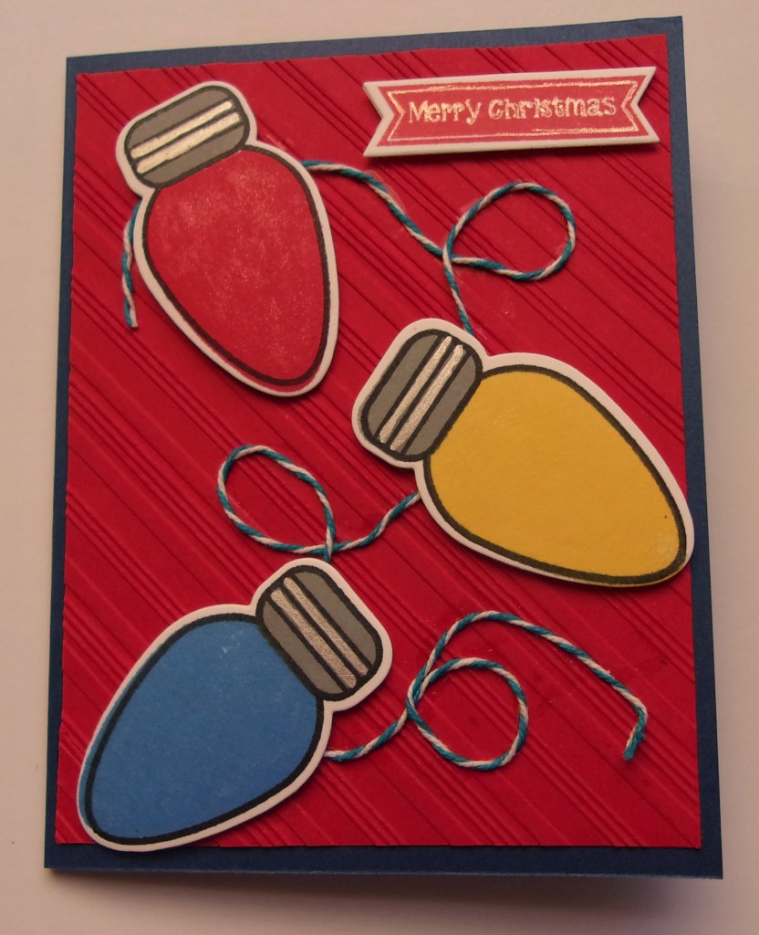 The Blended Seasons stamp set is red rubber, so the foliage will not curve easily, so my wreath is not as round as a photopolymer stamp would produce. The gold in the bells and foliage were colored with a gold gel pen. I made my own gold paper with embossing powder.
