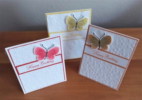 I like the simple look of these cards. The hardest part was finding the cardstock colors that matched the ink I used in the butterflies.