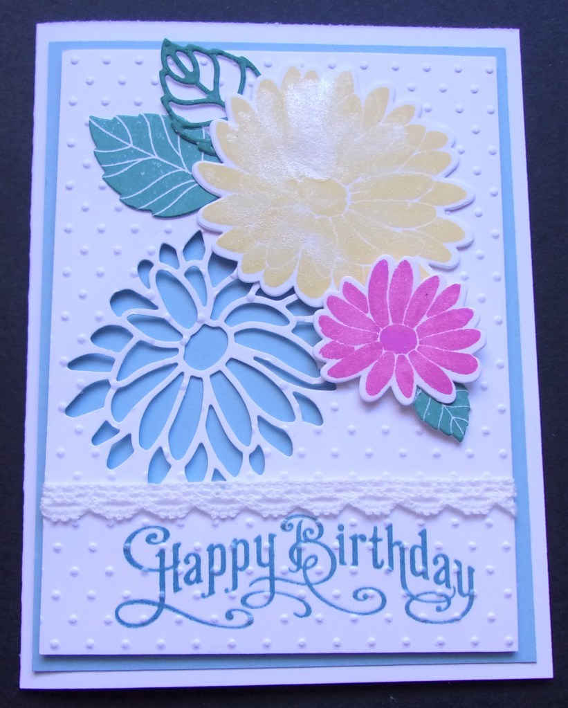 My card fits the bottom line. I used Stampin’Up sets Special Reason from 2017 and Perfectly Penned from 2011. There are dies that fit the images in Special Reason, so that takes care of the dies. The texture is created with the Swiss Dots Cuttlebug Folder as well as heat embossing the greeting. The color blue is Balmy Blue in the cardstock which is peeking through the die cut flower on the white layer. Other texture is the lace I used on the front.