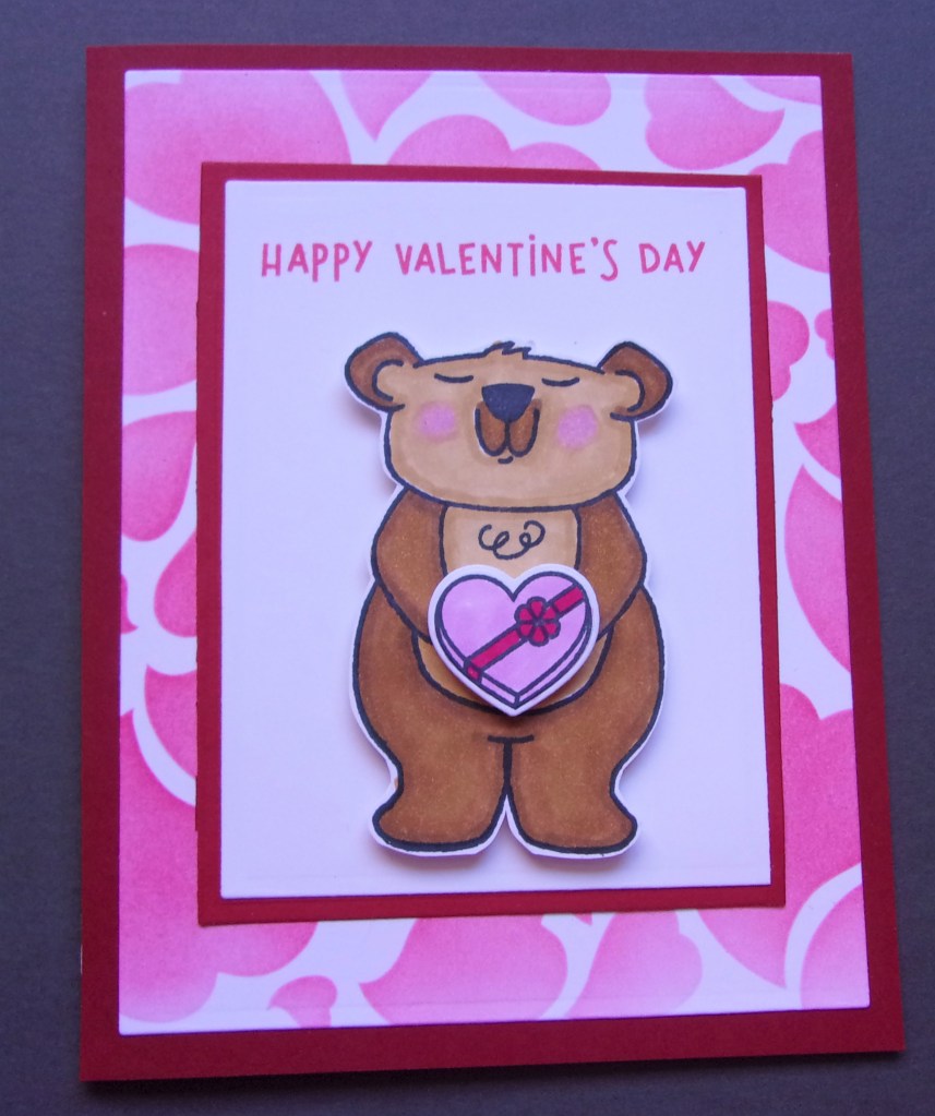 The bear is stamped from a Paper Pumpkin kit, Dec 2020. He is holding a heart from Lawn Fawn, scent with you add-on, as well as the greeting. I used a stencil from Colorbox. The bear turned out cute and I know a resident will enjoy the card.