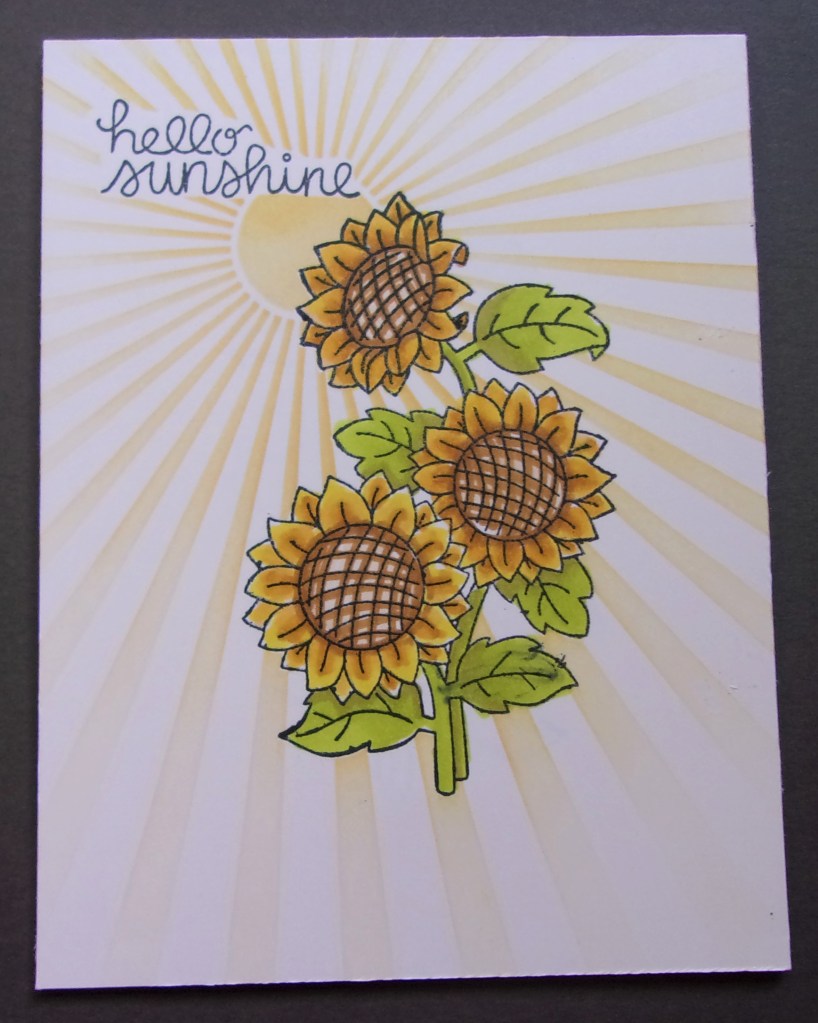 Each month I receive a stamped image and sometimes patterned paper to create a card with. The month of May was Sue’s month. I received images from Stampin Up Friendly Hello set and patterned paper. I own this set so I added a few leaves and a die cut to add a bit to balance my design.