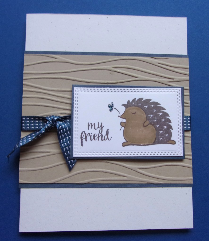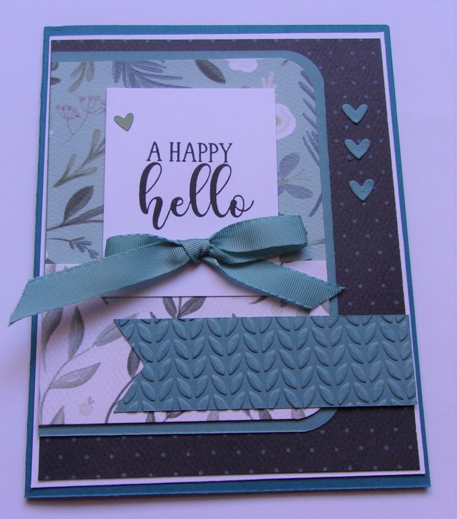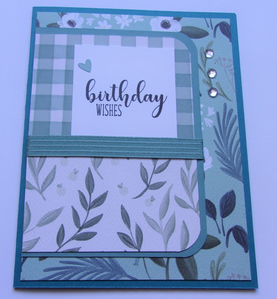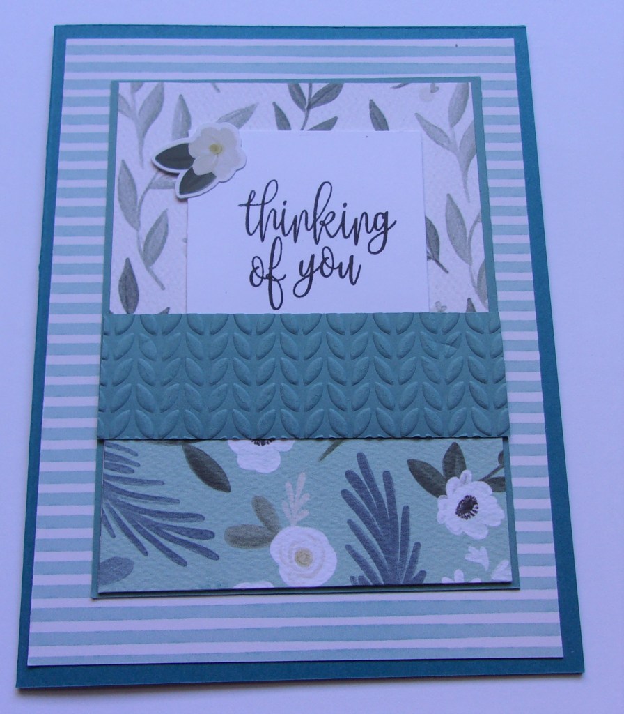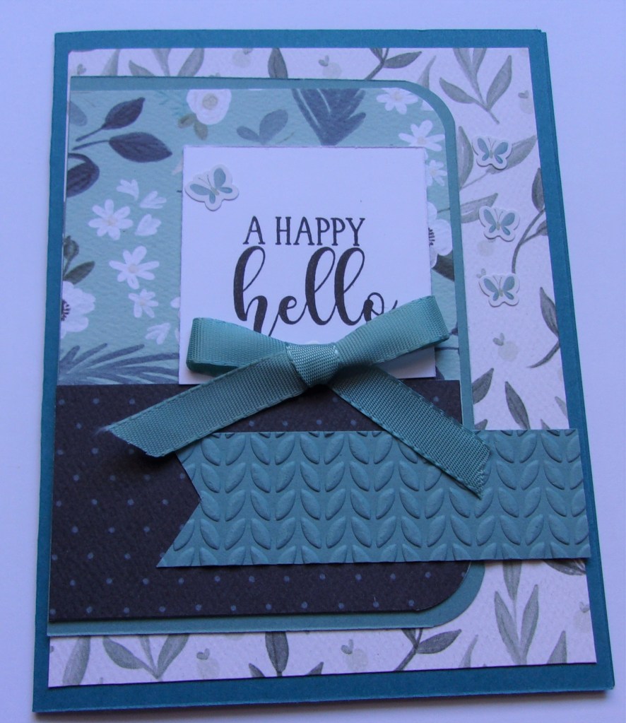 The above card and all following use the Home Again 12 X 12 scrapbook paper with stickers pack. The cardstock colors are Islands Indigo and Blue Lagoon from Stampin Up retired. The ribbon matches, Blue Lagoon. The banners are embossed with one of the Greenery embossing folders from SU; it is a set of 2 folders. The greetings are all from Gina K Designs sets. Some of the cards have smaller print patterns and those are from the 6 X 6 pad.