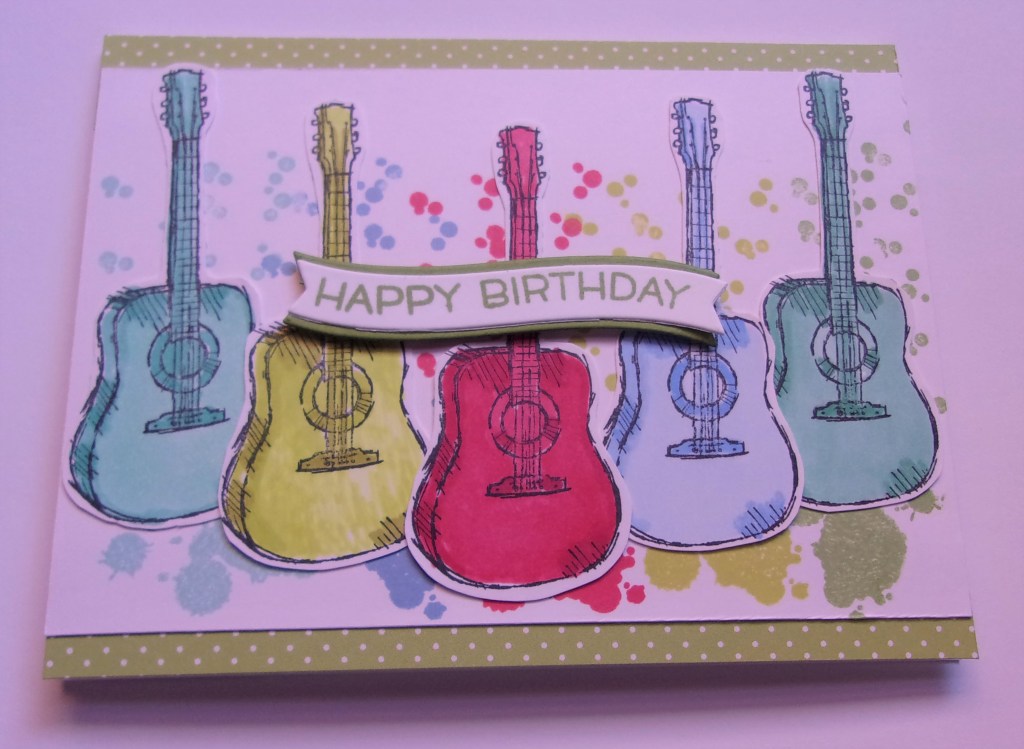 This card is my husband’s birthday card. He really liked it as it is all about guitars. These are acoustic and are not usually colored, but I needed the spread of color and it worked. All were fussy cut.