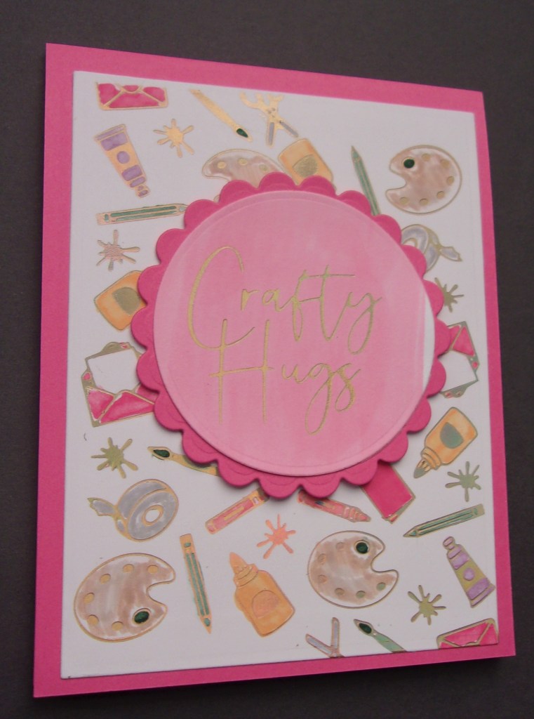 This card has a lot of pink. This person loves pink and this occasion fits pink. This pink is Polished Pink, which is a current In-Color from Stampin Up. Most of the marker colors are this year’s In-Colors with the neutral colors of tan and gray mixed in. I used a kit from Spellbinders Glimmer Hot Foil System from August 2020. I tried the club sets for a while, but was not learning quickly so stopped receiving them. This person is a hair dresser, so the request also mentioned adding scissors. I knew scissors were on this plate, so I thought it would be a good option for the card. She is also crafty and makes cards when she is well.
