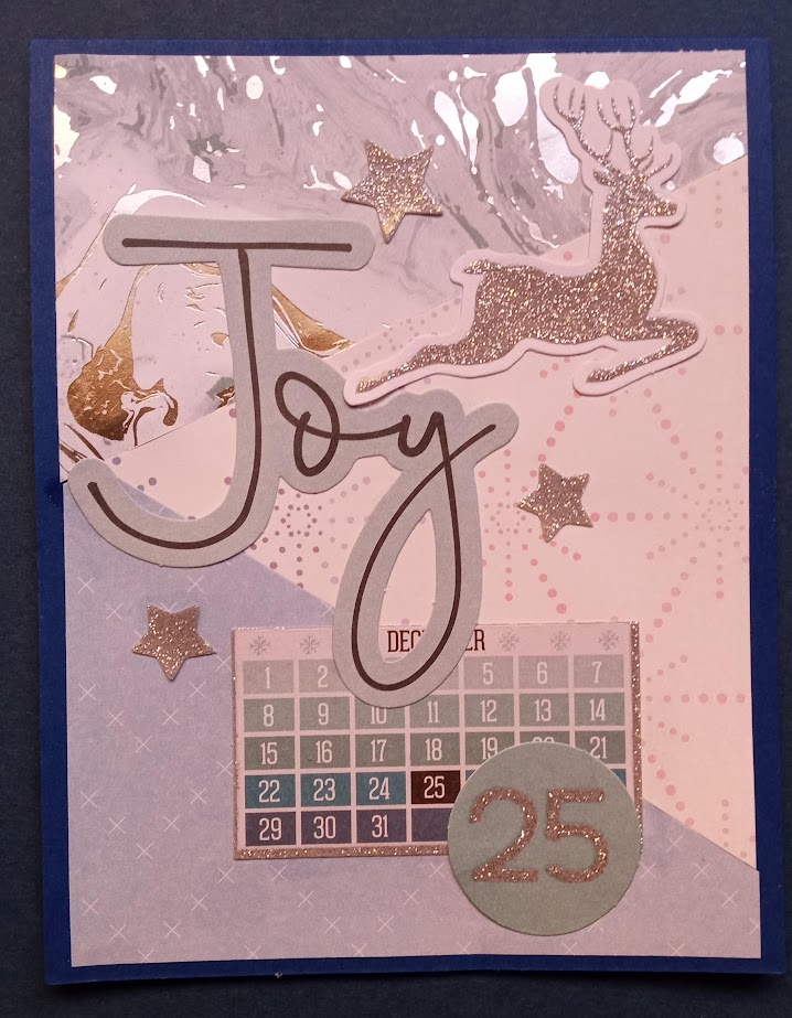 This card started as the alphabet challenge card at Splitcoaststampers for the letter J. I needed to use a word off of the list and one of my own. The word from the list was Jade and my own is Joyful. I used SU Just Jade for my cardbase and embossed layer. I used the Spellbinders Evergreen 3D embossing folder. The patterned paper is SU Flowers for Every Season. The brown paper is from Spellbinders. The greeting is Lawn Fawn Winter Wavy Sayings cut with a die from Simply Wavy Banners. I added SU snowflake sequins for a bit of sparkle.