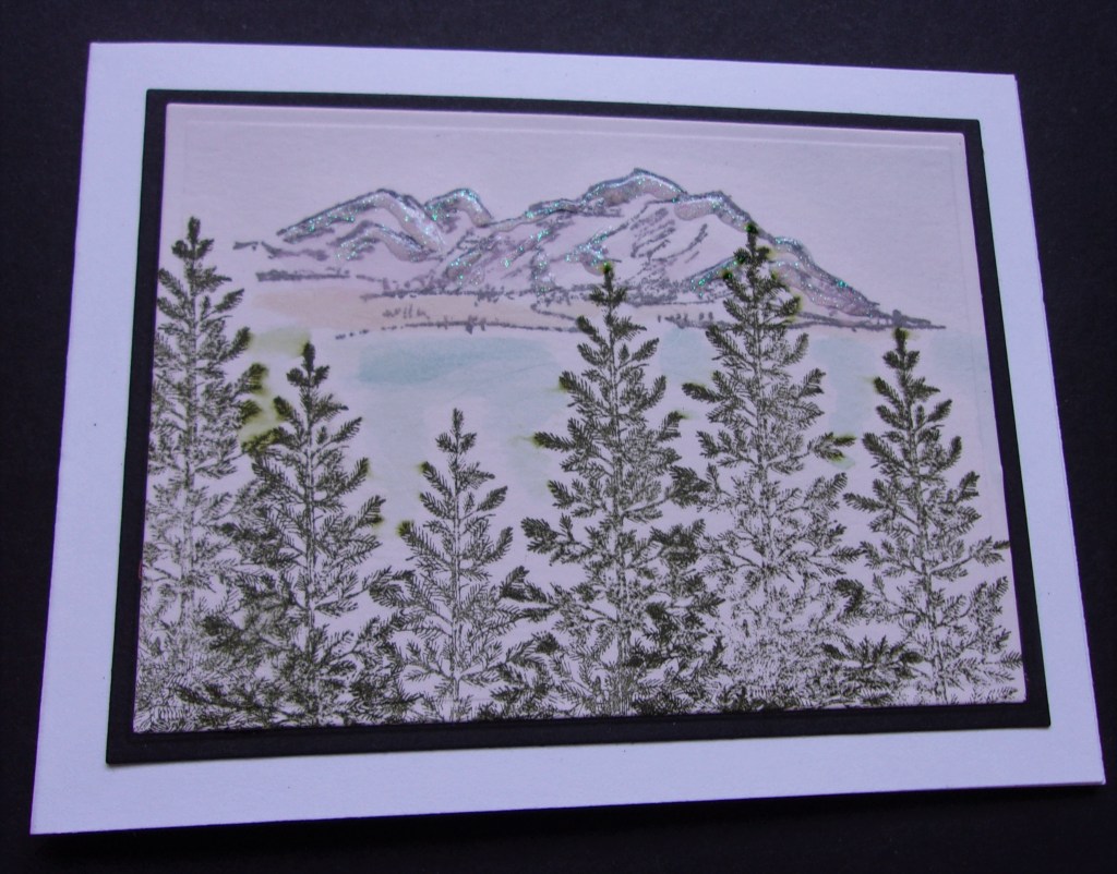 The third card is to have a snowy mountain. I used two SU sets to complete this card. Once again, I went to Pinterest for an idea. I stamped in Bristol paper and watercolored.