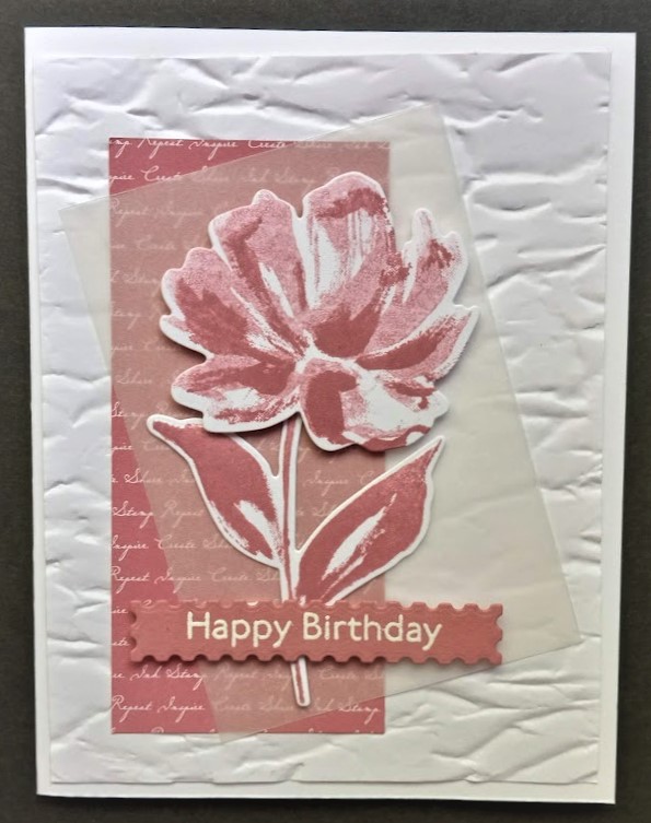 As I said, I used Ricocco Rose ink, vellum, SU patterned paper in the Ricocco Rose color, and the embossing is both heat and dry. The dry embossing uses a folder called Old World Paper. The Happy Birthday is heat embossed on Ricocco Rose cardstock in white.